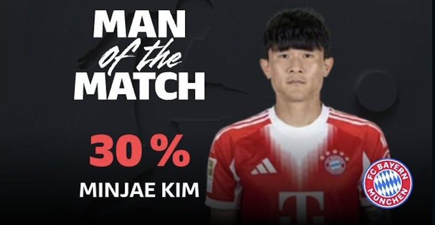 德甲第17轮,拜仁慕尼黑客场3-1逆转击败科隆,此役打入一球的拜仁后卫金玟哉当选德甲官方全场最佳球员。