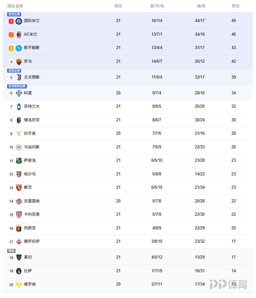 意甲积分:米兰距榜首3分+20轮不败 罗马3连胜紧追前3